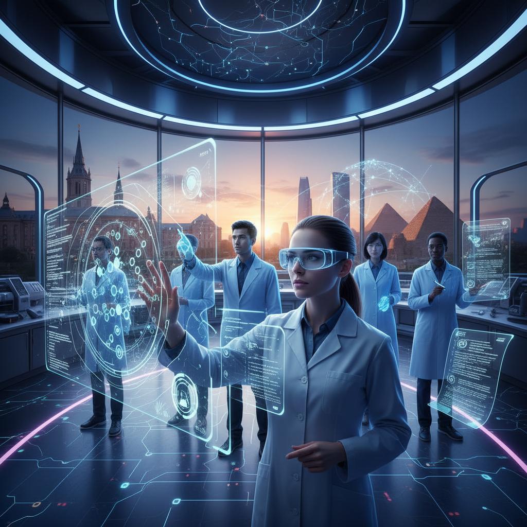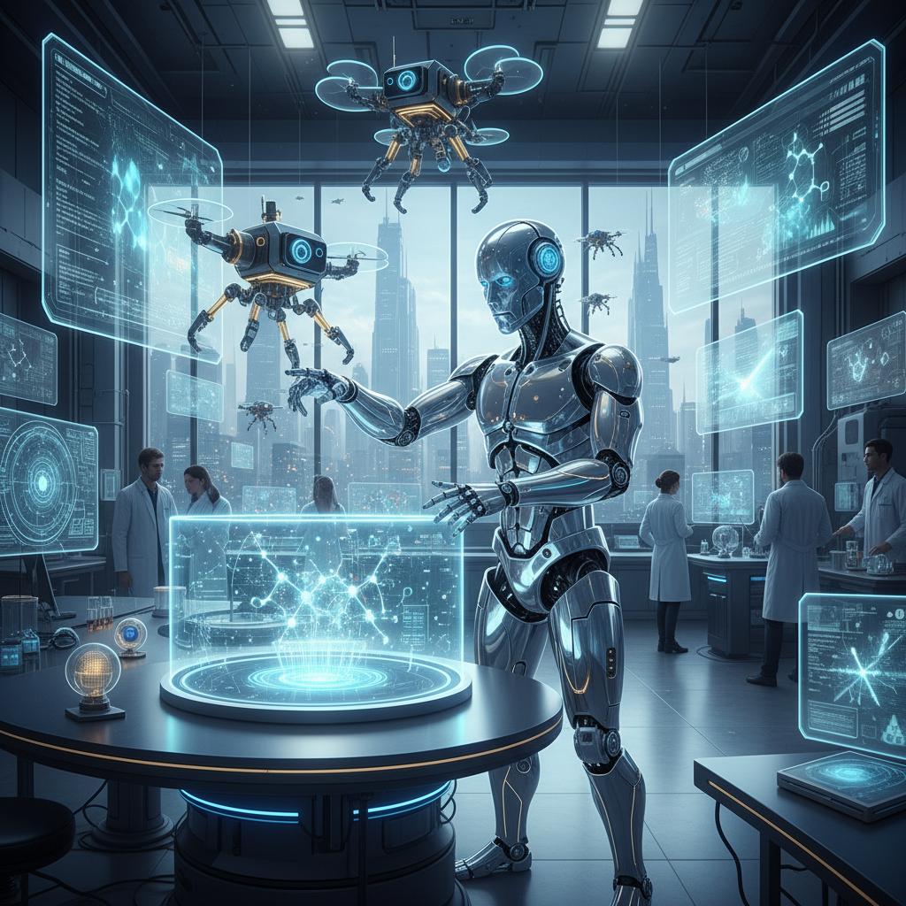 Futuristic lab with ARAs using advanced technology. Alt: The future of academic research assistant roles.