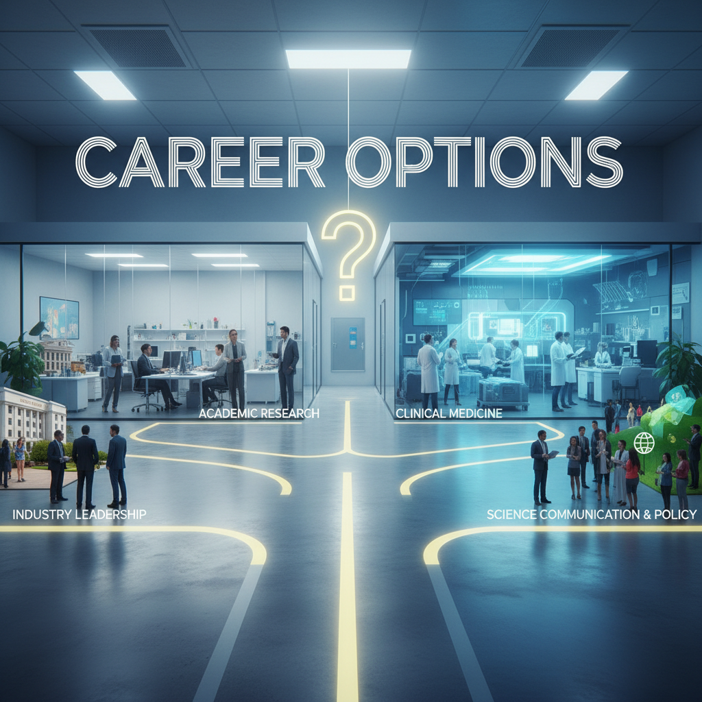 Alt text: Forked path in a research environment, representing branching career options after research assistantship.