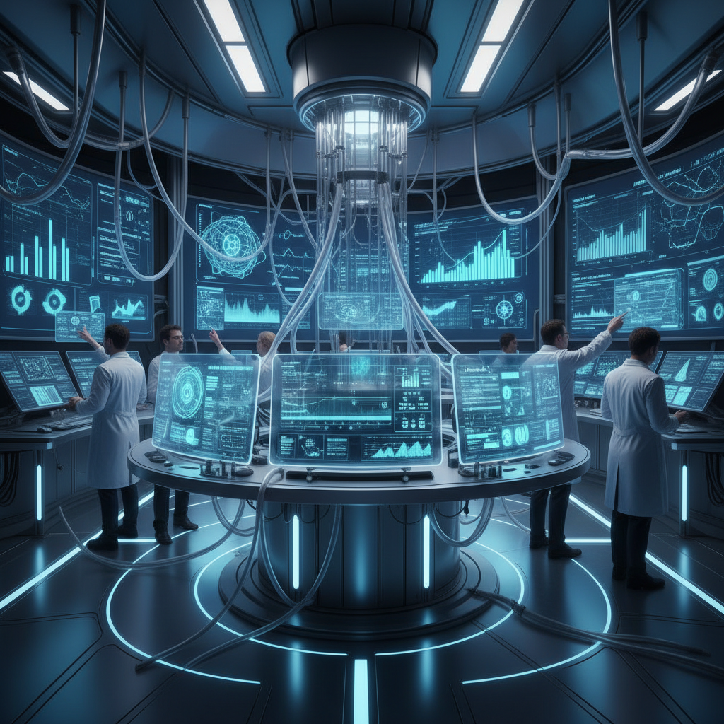 Alt text: Researcher collaborating with AI assistant in a modern lab to accelerate academic research processes