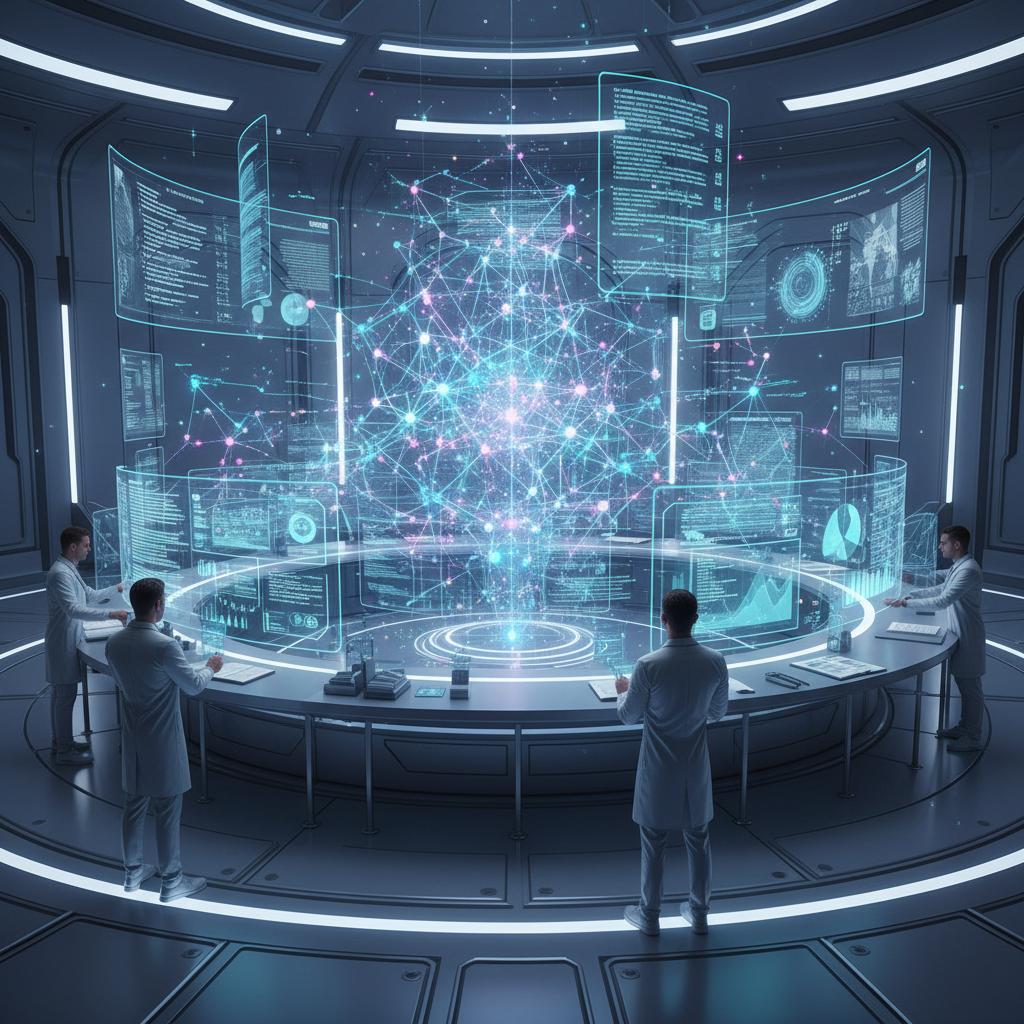 Alt text: Scientists in a high-tech lab reviewing AI-generated data projections, highlighting AI-driven academic data analysis in STEM breakthroughs.