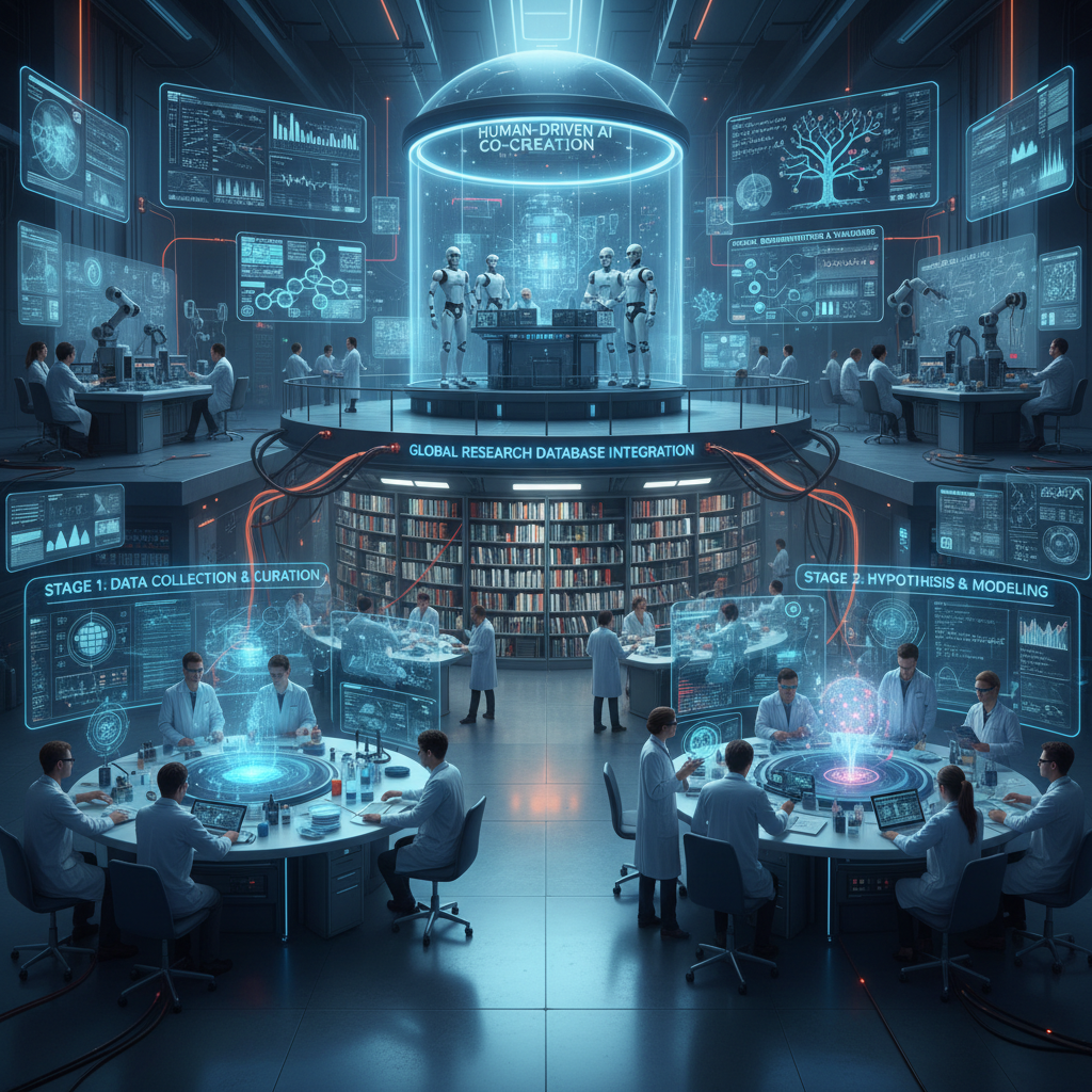 Alt text: Researchers collaborating in a lab environment around a digital interface for automated literature review, demonstrating an alternative to manual literature processes.