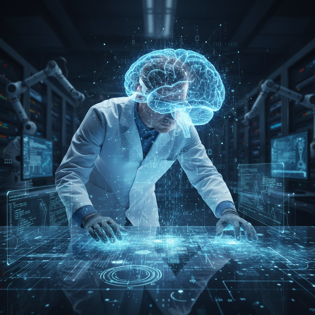 Image: AI-brain overlay on a researcher analyzing data streams. Alt: AI-powered innovation research visualization.