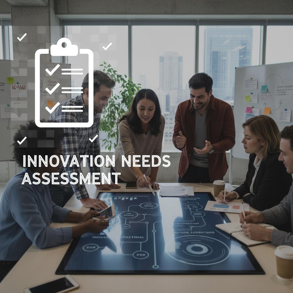 Image: Checklist overlay on a whiteboard session. Alt: Team evaluating innovation needs.