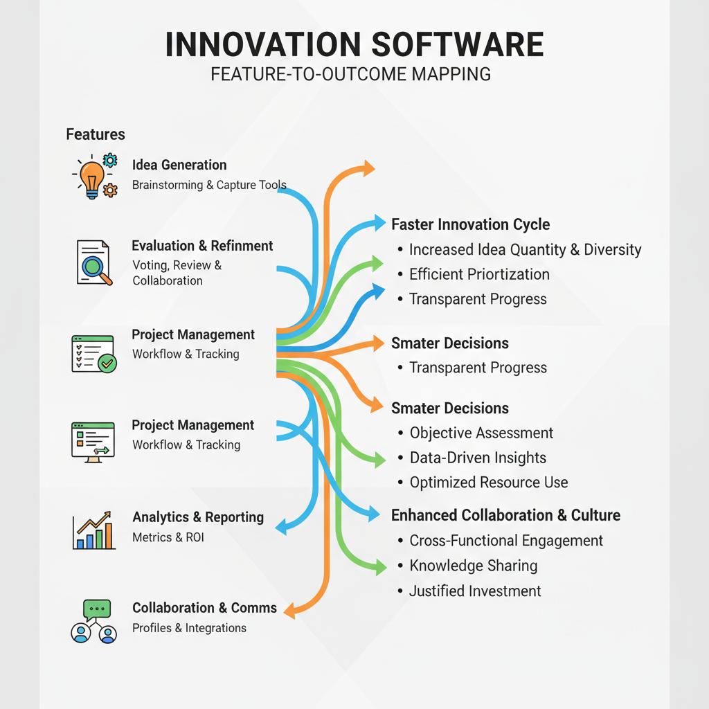 Image: Flowchart of feature-to-outcome mapping. Alt: Innovation software outcomes flowchart.