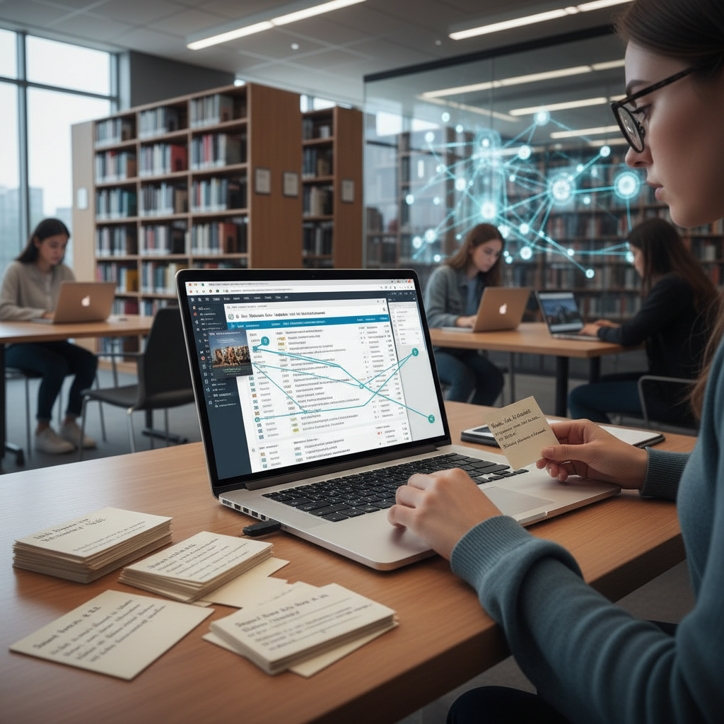 Alt: Index cards and laptops side by side in a library, symbolizing the evolution of reference management tools and digital citation management