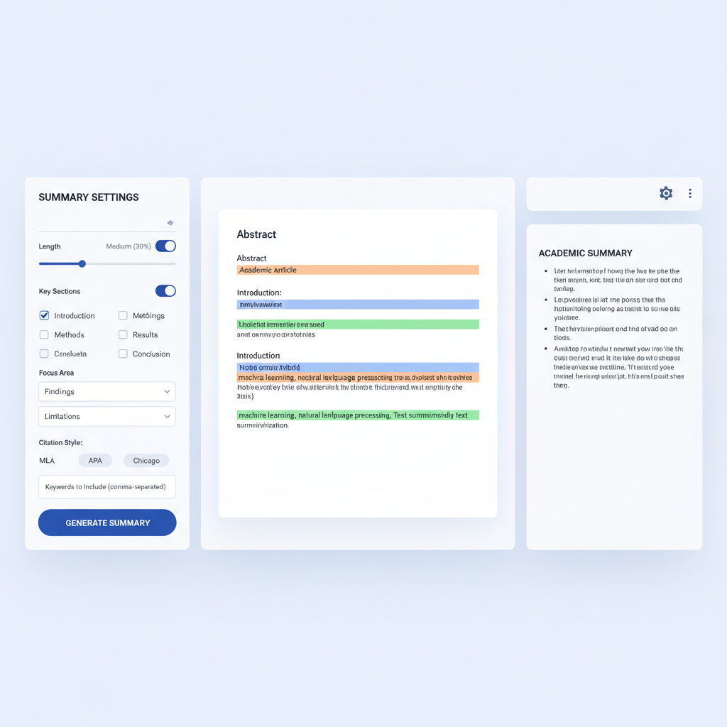- Specify summary type: Choose between abstract, executive summary, annotated bibliography, or custom options.