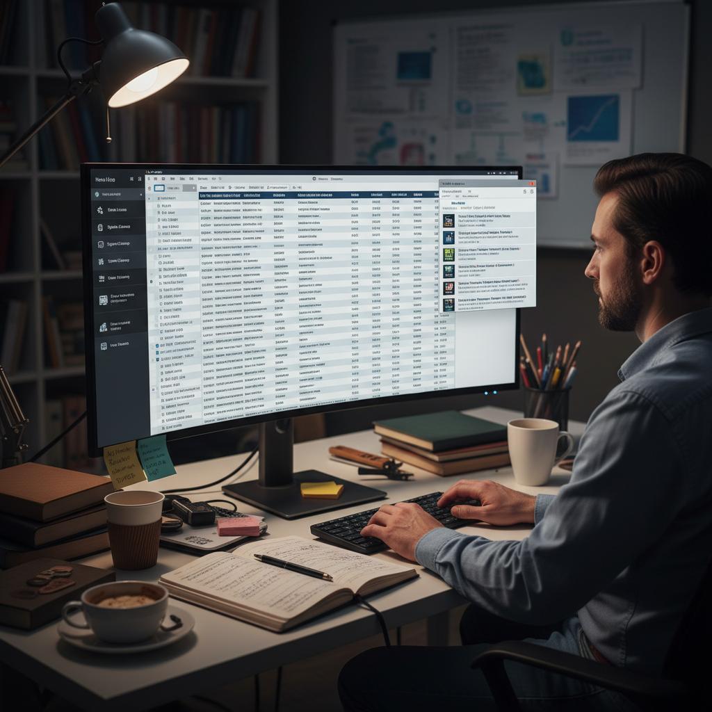 Close-up shot of a digital audit log glowing on a dual-monitor setup, with academic journals and sticky notes scattered around. Alt text: Digital audit trail on researcher’s monitor, rigorous academic analysis software visible.