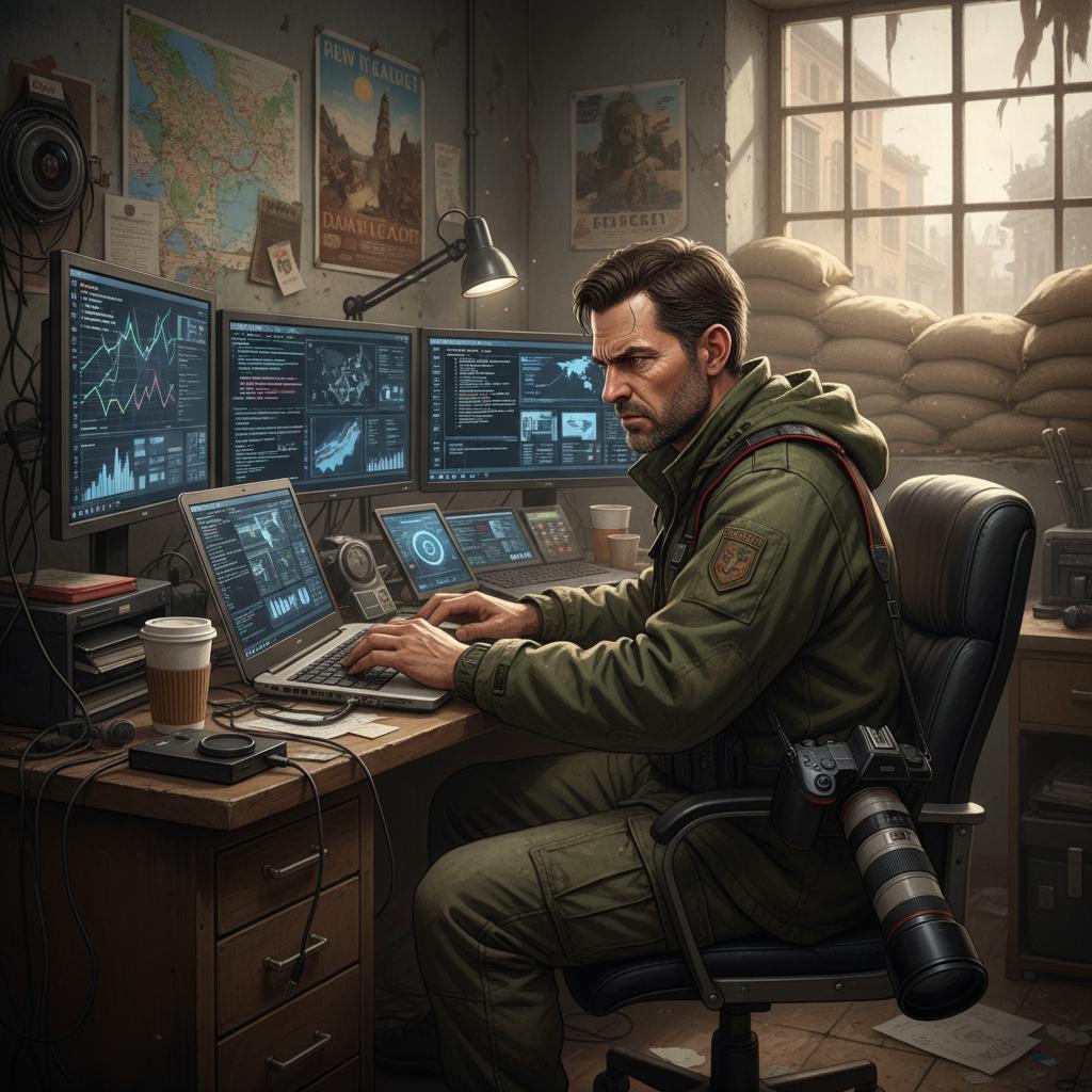 Photojournalist surrounded by documents and laptops, laser-focused on data. Alt text: Journalist analyzing data for investigative story, rigorous academic analysis software on screen.