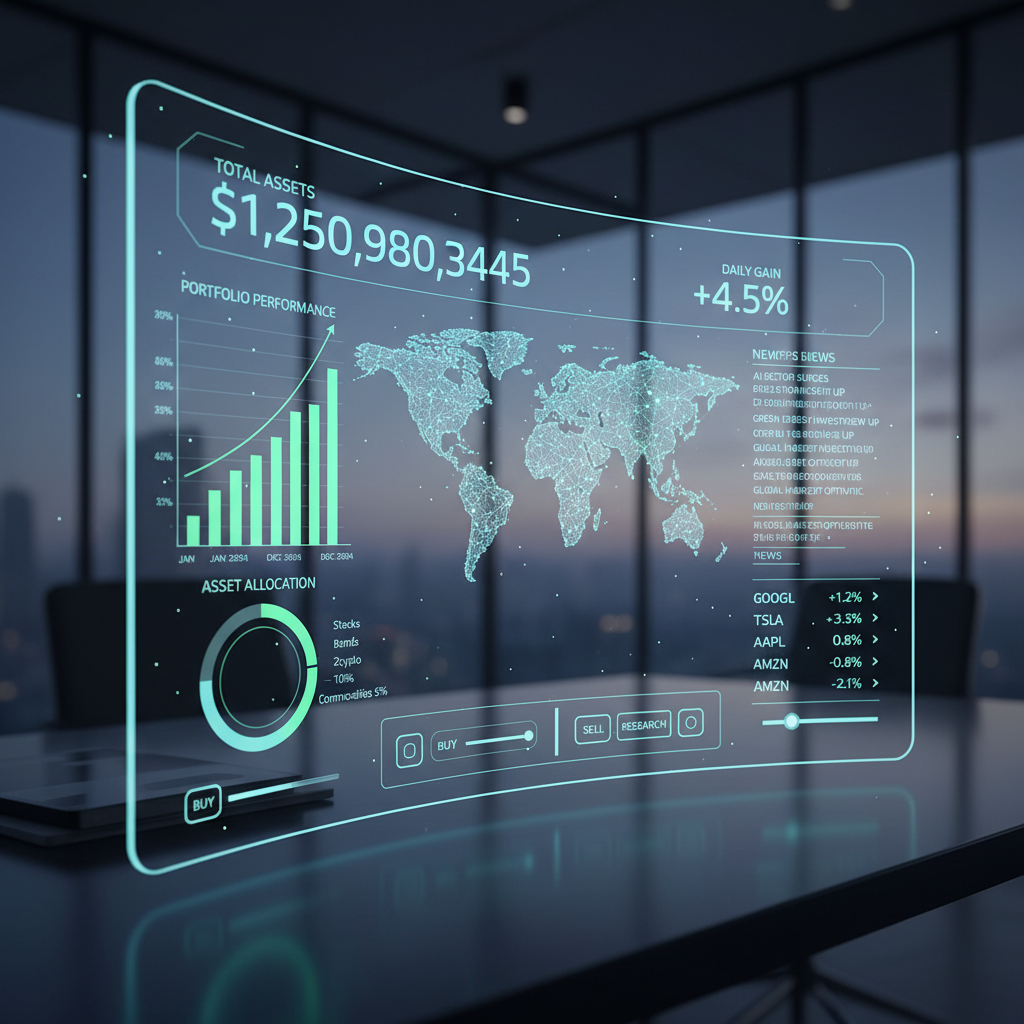 Alt text: Modern investment tool interface with interactive data overlays and a human hand making strategic decisions.