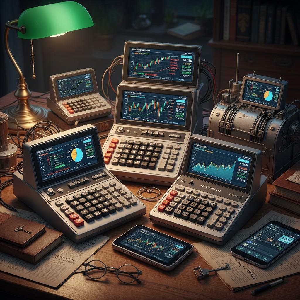 Alt text: Contrast between old and new investment tools, including vintage calculators and modern digital screens with stock charts.