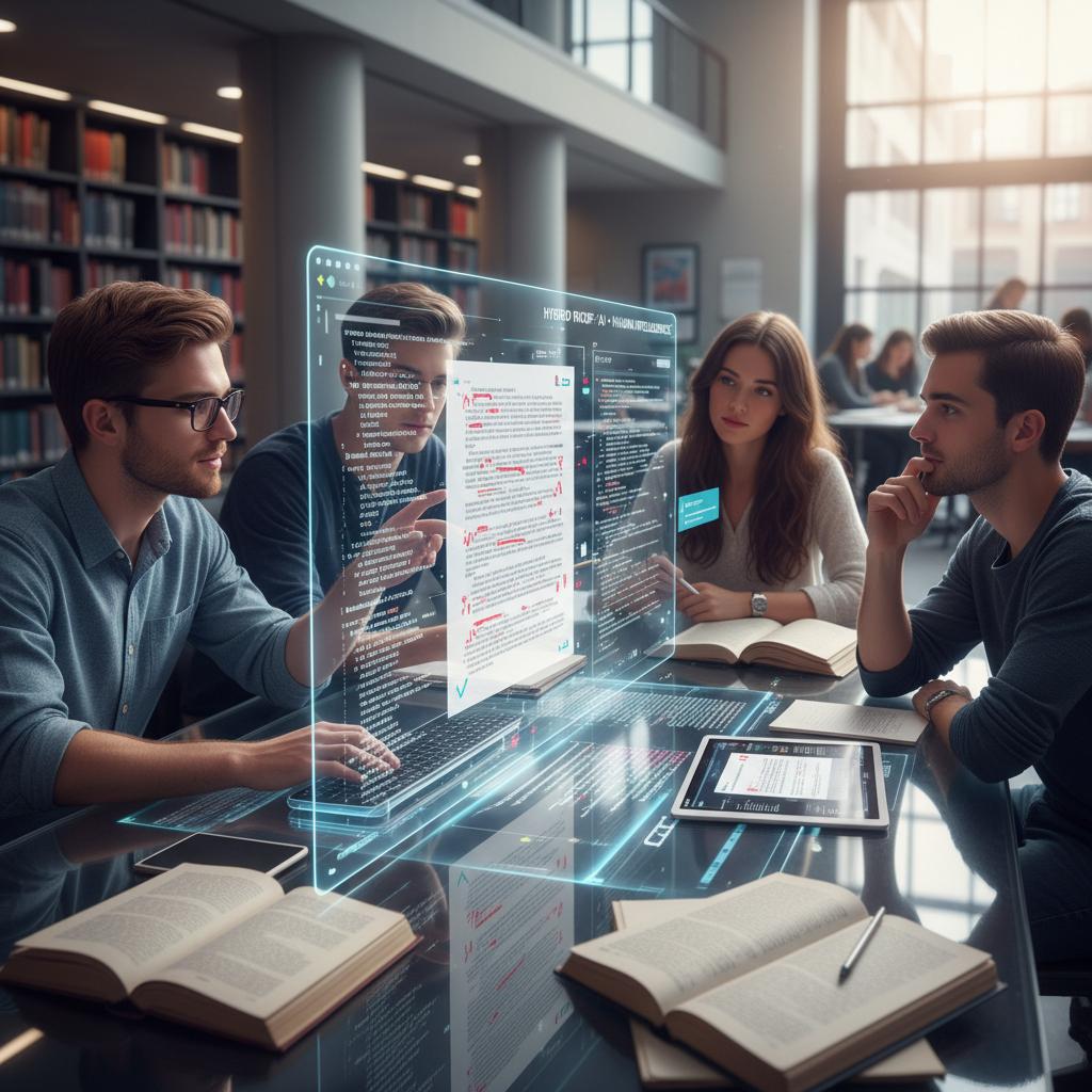 Alt: The hybrid future of academic proofreading, showing students, AI code, and marked-up manuscripts working together.