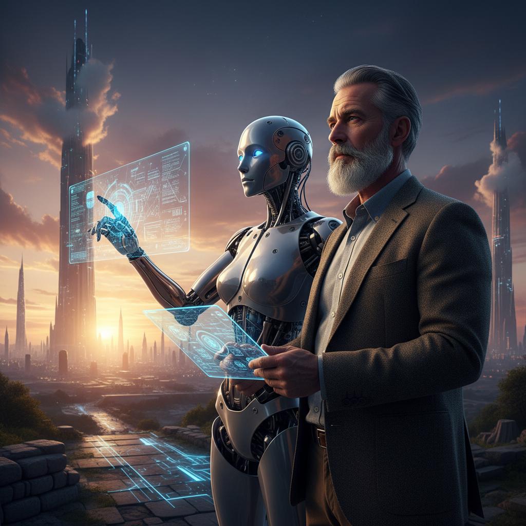 Alt text: Artistic photo of a professor and digital assistant side-by-side, both gazing at a horizon, symbolizing the future of academic collaboration