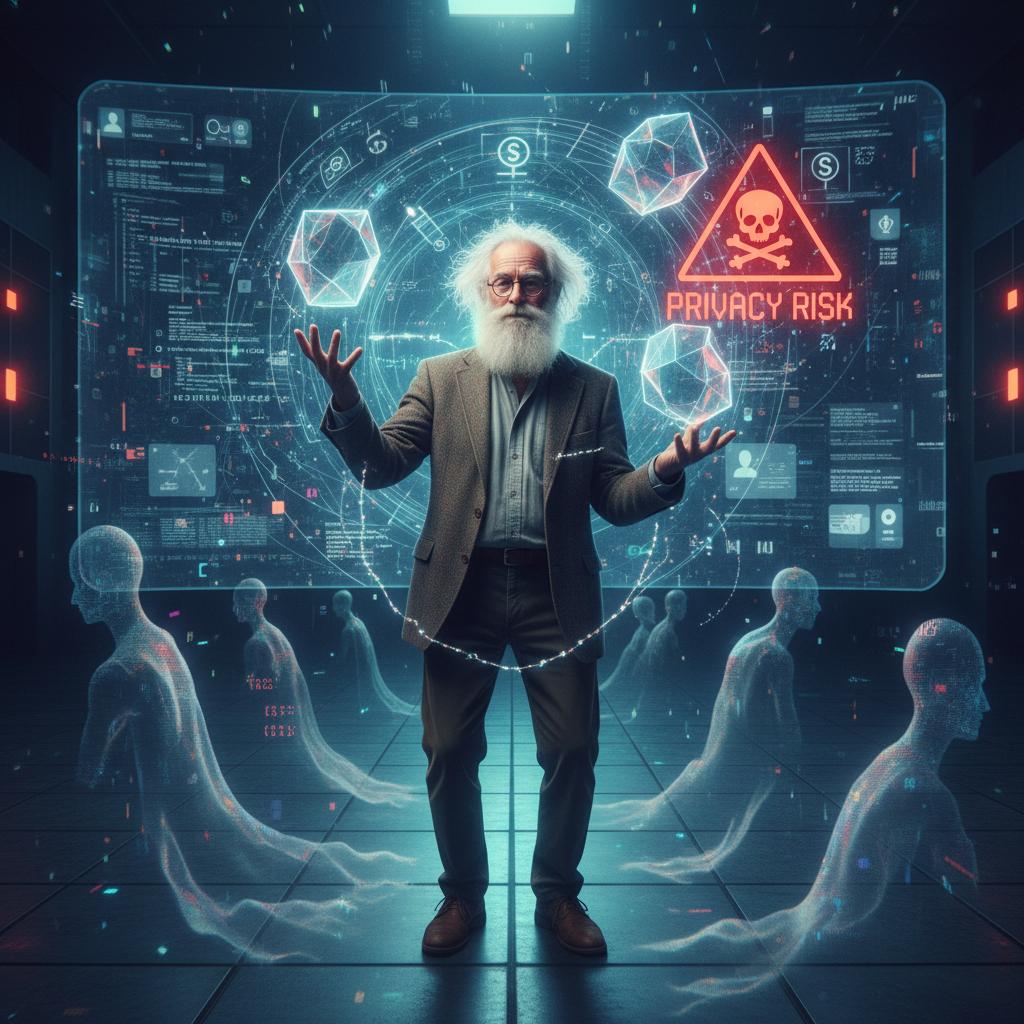 Alt text: Symbolic photo of a professor juggling both data and digital shadows, representing privacy and bias concerns in academic AI