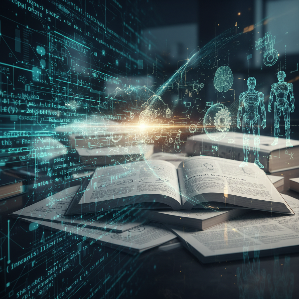 Photo: Stacked books merging with digital resources, symbolizing the fusion of traditional and AI-powered research.